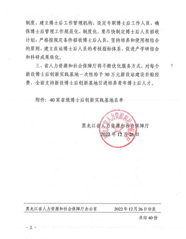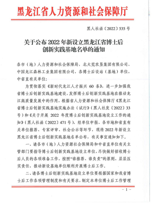 近日,由黑龍江省人力資源和社會保障廳組織開展的2022年度黑龍江省博士後創新實踐基地設立工作已經落下帷幕,經各企事業單位申報、市地人社局和省直單位推薦、專家評審、網絡公示等程序,哈爾濱劍橋學院成功獲批設立黑龍江省博士後創新實踐基地。這標誌着學校在促進產學研結合和加強高層次人才培養等方面邁上了新高度,為學校科研創新工作開創了新局面,對學校的發展建設具有里程碑意義。哈爾濱劍橋學院是黑龍江省民辦高校首家設立省博士後創新實踐基地的學校。