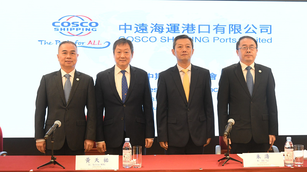 中遠海運港口(1199)截至今年6月底止,中期純利按年減少15.4%,至1.5億元(美元,下同),第一次中期息每股1.744仙,按年減少18%。董事總經理朱濤(圖右二)表示,隨着下半年企業庫存消化加快,加上正值歐美市場傳統旺季,有望刺激貨運需求,加上旗下碼頭有望奪得亞洲區內的新航線,下半年整體吞吐量有望改善。