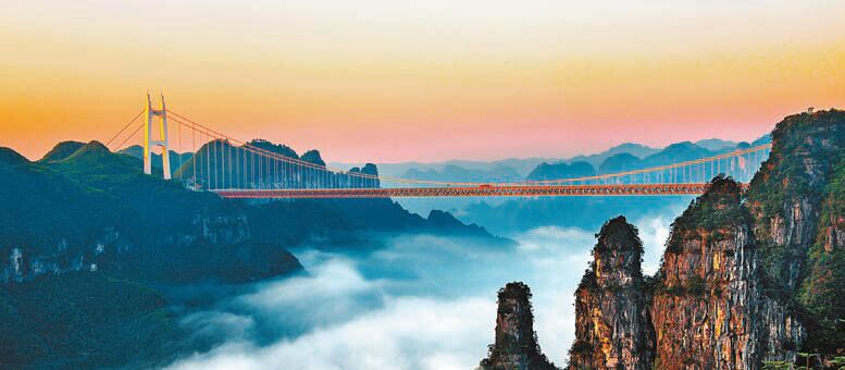 矮寨特大懸索橋位于湖南省湘西州吉首市矮寨鎮境內,距吉首市區約20公里,是國家重點規劃的8條高速公路之一——長沙至重慶通道湖南段吉(首)茶(峒)高速公路中的重點工程。工程為雙層公路、觀光通道兩用橋梁,四車道高速公路特大橋。橋型方案為鋼桁加勁梁單跨懸索橋,全長1073.65m,懸索橋的主跨為1176m,創造了四項世界第一,極大地改善湘渝兩省市的交通現狀,對兩省市乃至中西部的對接具有極其重要的意義。