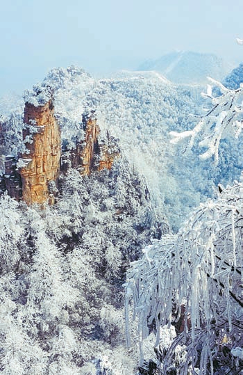 在張家界國家森林公園銀色世界里,金鞭巖以錚錚鐵骨般的挺立表現出一種雄性的力量,金鞭溪宛如少女般婉約而靈動。拾級登上袁家界,隻見低處白絮成堆,玉樹銀樓交輝,穿行在灌木叢中,便能攀扯出一枝枝美麗的珊瑚花!而登上氣勢雄偉的天子山,只見蒼茫大地一片潔白,映入眼簾的是一片冰天雪地,那雪皚皚的蒼茫壯闊令人心曠神怡!