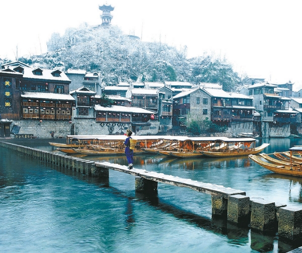 平日里大家看到的鳳凰古城大多是無雪時期的樣貌,到了冬天,如果遇上一場大雪,這里將是另外一幅難得的景致。其時的沱江河兩岸,屋舍樓宇皆披上銀裝,江船、樓閣輪廓分明,跳巖、虹橋、吊腳樓在一派朦朧的雪白世界里顯得格外出塵脫俗,回歸了其嫺靜的本色。