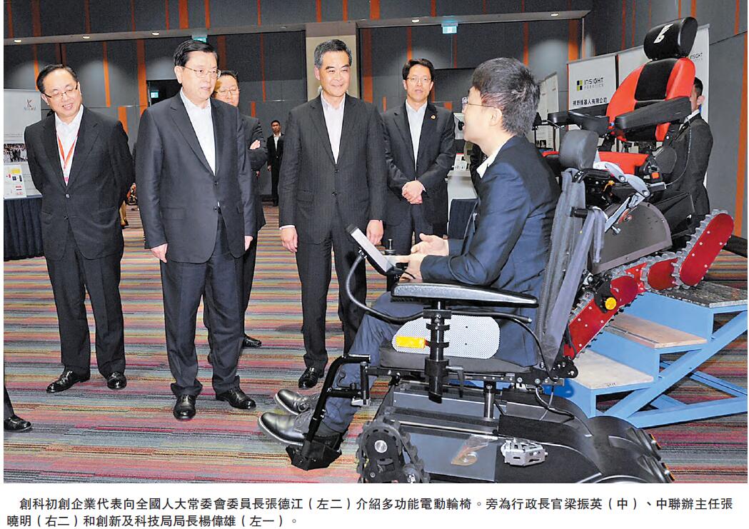 张德江亦听取了有关港科院的工作介绍、本港大学的创科工作及成功研发例子、国家重点实验室和国家工程技术研究中心在香港的夥伴实验室和分中心的工作,以及研发机构和企业间的合作。其後,5位本地创科初创企业创办人向张德江介绍最新的科研技术及示范产品,包括研发防火机械人的岑棓琛、专注於计算机视觉和深度学习原创技术的徐立、基因组学先驱和发明无创产前检测的卢煜明教授、专门研发多功能电动轮椅的李少麟,及研发生物人工心脏供药物测试的李登伟教授。