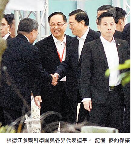 张德江车队约下午3时半抵达科学园第三期其中一幢大楼,创新及科技局局长杨伟雄在场迎接。张德江先与各界代表握手,包括工业总会主席刘展灏、港科院院长徐立之、港大校长马斐森等。