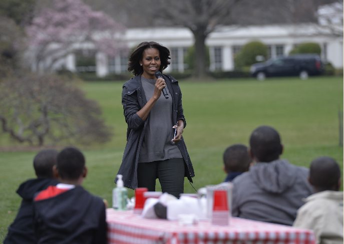 4月2日,在美国华盛顿白宫南草坪的白宫菜园,美国第一夫人米歇尔·奥巴马给来参加种菜活动的当地学生宣讲健康饮食理念。