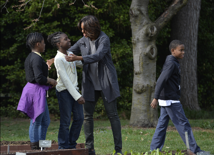 4月2日,在美国华盛顿白宫南草坪的白宫菜园,美国第一夫人米歇尔·奥巴马与参加种菜活动的学生拥抱告别。