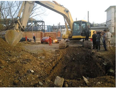 在该片区域内,施工方已经挖掘出自流沟的具体位置。这条自流沟南侧20多米,是兰州石化302工厂,北侧60多米是兰州石化303、304工厂。化工厂的部分管线从自流沟下穿行。