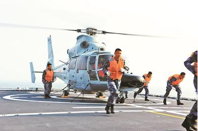 4月23日,参加演习的中方导弹护卫舰烟台舰上的舰载直升机紧急起飞供图/新华社