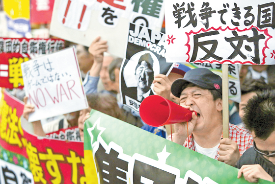安倍呼籲對日本自衛隊海外作戰能力的法律限制進行重審,一直被認為是想刪除日本長期受制於戰後和平主義的藩籬,不過為了緩解亞洲鄰國及謹慎日本選民的擔憂,安倍同時承諾日本將堅持和平道路,不會再次成為「發動戰爭的國家」。