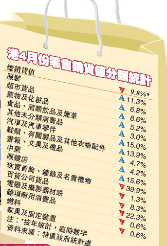 同时,电器及摄影器材销量大跌8%,拖累本港4月零售销货总值下跌9.8%,创5年多最大跌幅,市场原本预期跌 4.4% ,3月亦向下修订至跌 1.5% 。数字显示,虽然内地旅客数字不断上升,按月较去年多数万人,但人均消费下降,反映内地客消费模式已进一步改变。