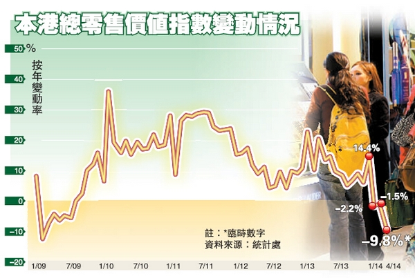 日前港府传出声音指正研究削减内地自由行来港人数引发社会热议;特首梁振英曾称,希望4月零售销售数据公布後,市民可进一步讨论限制自由行人数对香港的影响——最新公布的零售数据显示,本港4月份零售销售货值仅388亿元,按年下跌9.8%,创2009年2月以来最大跌幅,并已连跌3个月;零售销货量亦下跌9.5%,同样远逊市场预期。分析人士称,本港零售销售将持续录得负增长;有业界人士则指,本港零售业陷入低迷之际,政府不应考虑削减自由行。