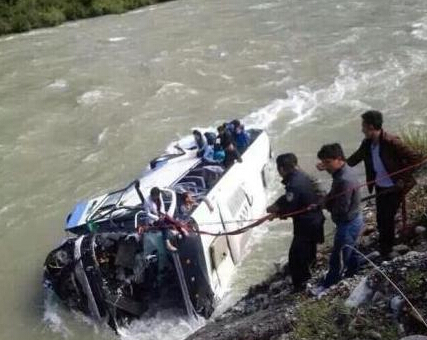 西藏一核载47人大巴车因前轮爆胎翻入河道(图)