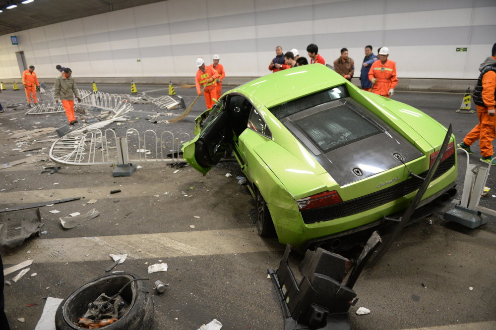 據多名網友提供的照片顯示,一輛綠色蘭博基尼被撞毀,幾十米外一輛紅色法拉利后部亦有被撞凹印。隧道中間的隔離護欄被撞斷,道路上散落著許多車身碎片。