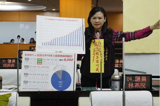 據台灣《聯合報》報道,國民黨籍台南市議員林燕祝11日在議會召開的登革熱項目會議上,秀出“蚊子不叮我”符咒貼紙,並貼在自己胸口,表示現在台南登革熱疫情嚴峻,人人自危,只能想盡各種妙方防蚊,希望市府趕緊想辦法抑制疫情。