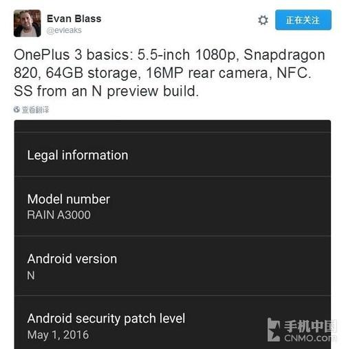 根據曝光的配置信息顯示,一加3的設備型號為RAIN A3000,系統為最新的穀歌Android 7.0,氧OS 3.1.0,同時應用了穀歌5月份的安全補丁。不過目前Android N正式版本還未推出,一加3所采用的開發者版不知道發布當時是否能真正用上,不然的話只能等待後續更新。
