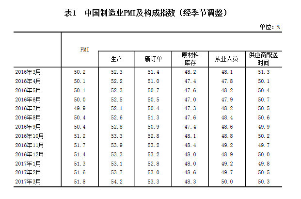 2017年3月份,中国制造业采购经理指数(PMI)为51.8%,连续两个月上升,高于上月0.2个百分点,制造业持续保持稳中向好的态势。