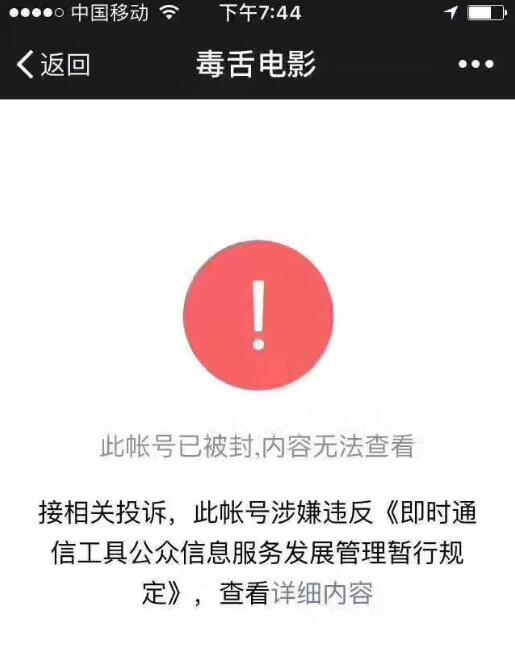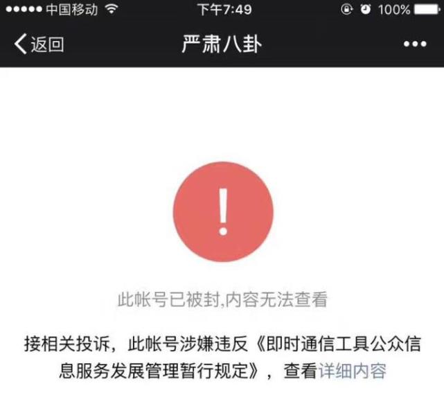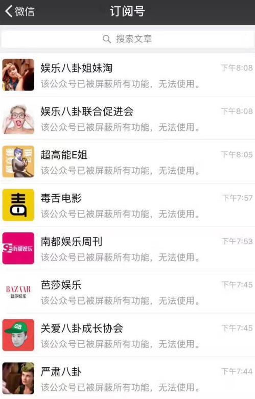 8日晚間,又有大批娛樂公眾賬號被封。據悉,嚴肅八卦、關愛八卦成長協會、毒舌電影、南都娛樂周刊、芭莎娛樂都已經被封號。