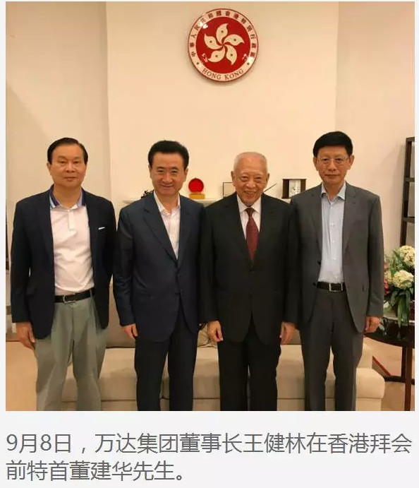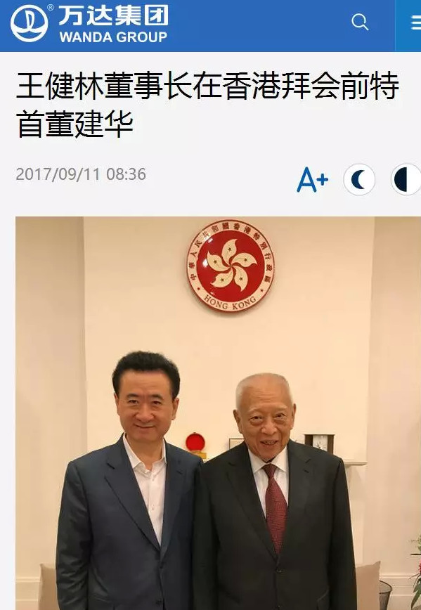 9月11日8:36,萬達集團官網發布了一條關於董事長王健林的新聞,全文只有一句話:9月8日,萬達集團董事長王健林在香港拜會前特首董建華先生,同時配發了2張老王與董建華的合影。