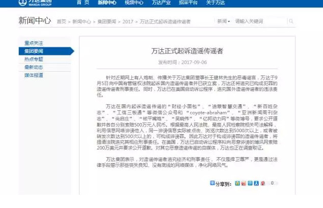 在美國,萬達已啟動訴訟程序擬向惡意誹謗的博訊網索賠200萬美元並要求公開道歉。另外,對其他惡意造謠的自媒體,正在收集證據,一旦取證完畢,將立即予以起訴。