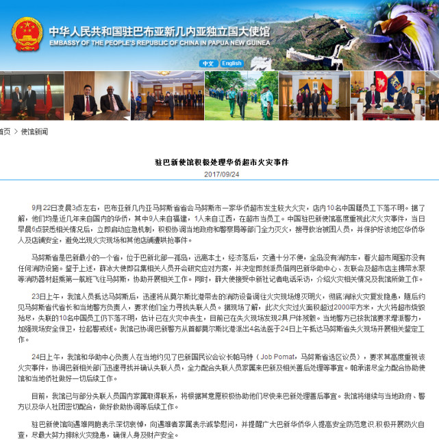 9月24日上午,使馆和华助中心负责人在当地约见了巴新国民议会议长帕马特(Job Pomat,马努斯省选区议员),要求其高度重视该火灾事件,协调巴新相关部门迅速寻找并确认失联人员,全力配合失联人员家属来巴新及相关善后处理等事宜。帕马特承诺尽全力配合协助使馆和当地侨社做好一切后续工作。