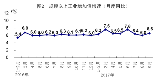 前三季度,全国规模以上工业增加值同比实际增长6.7%,增速比上年同期加快0.7个百分点。分经济类型看,国有控股企业增加值增长6.8%,集体企业增长0.3%,股份制企业增长6.8%,外商及港澳台商投资企业增长7.1%。分三大门类看,采矿业增加值同比下降1.6%,制造业增长7.3%,电力、热力、燃气及水生产和供应业增长8.4%。工业向中高端迈进,前三季度高技术制造业和装备制造业增加值同比分别增长13.4%和11.6%,分别快于规模以上工业6.7和4.9个百分点。前三季度,规模以上工业企业产销率达到97.8%。9月份,规模以上工业增加值同比增长6.6%,比上月加快0.6个百分点,环比增长0.56%。9月份,制造业采购经理指数为52.4%,比上月提高0.7个百分点,达到2012年5月份以来的最高点。