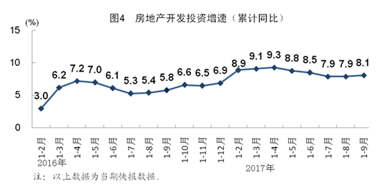前三季度,全国房地产开发投资80644亿元,同比增长8.1%,增速比上年同期加快2.3个百分点。其中,住宅投资增长10.4%。房屋新开工面积131033万平方米,同比增长6.8%,其中住宅新开工面积增长11.1%。全国商品房销售面积116006万平方米,增长10.3%,其中住宅销售面积增长7.6%。全国商品房销售额91904亿元,增长14.6%,其中住宅销售额增长11.4%。房地产开发企业土地购置面积16733万平方米,同比增长12.2%。9月末,全国商品房待售面积61140万平方米,比上月末减少1212万平方米。前三季度,房地产开发企业到位资金113095亿元,同比增长8.0%。