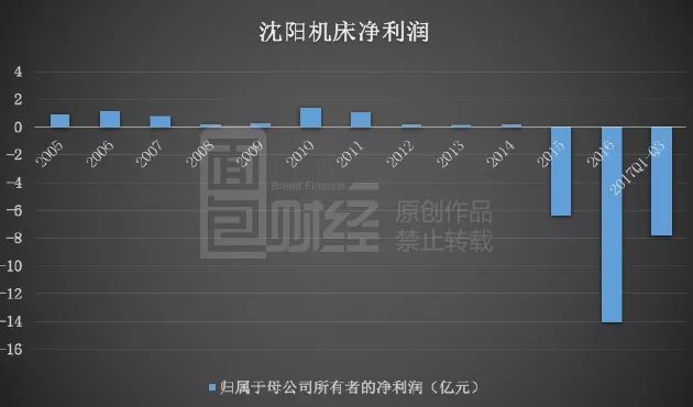 但是最两年,由于行业较为低迷等内外部因素,沈阳机床陷入亏损。2015年,亏损6.38亿,2016年亏损扩大到14.03亿,两年合计亏损超过20亿元。下图为面包财经根据财报绘制的沈阳机床总营收与净利润: