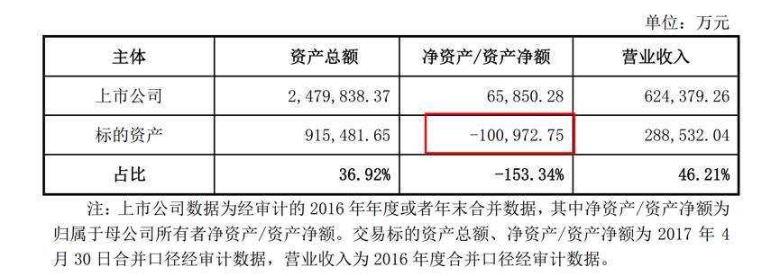 截至2017年4月底,这次交易标的总资产约91.54亿,总负债为101.64亿。资产大于负债,因此净资产为负10.09亿。