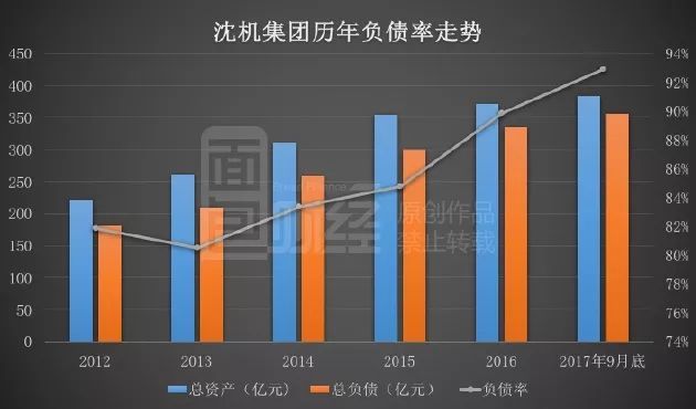 财报显示:最近两年沈机集团自身也处于亏损状态,2016年亏损金额达到16.76亿元。负债率也不低,维持在90%左右。下图为面包财经根据财报绘制的沈阳机床集团历年负债率走势: