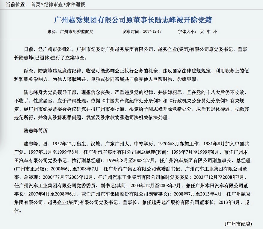 12月17日,广州市纪委监察局(以下简称“广州纪委”)发布纪律审查案件通报公告,公告内容称经广州市委批准,广州市纪委对广州越秀集团有限公司、越秀企业(集团)有限公司原党委书记、董事长陆志峰(已于2013年4月退休)进行了立案审查。