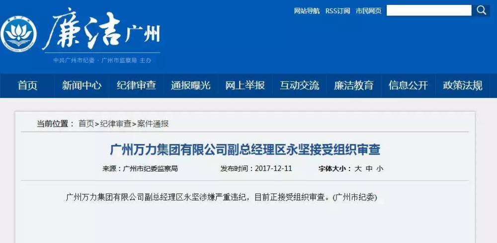 12月11日,广州市纪委曾发布纪律审查案件通报公告,公告显示,广州万力集团有限公司(以下简称“万力集团”)副总经理区永坚涉嫌严重违纪,目前正在接受组织审查。区永坚担任万力集团副总经理仅20天有余,在此之前,他曾担任广汽集团副总经理、广汽三菱董事长。因此,业内人士猜测区永坚此次接受案件调查很有可能是在广汽集团任职期间发生了问题。