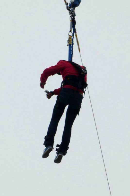 消息稱,昨午2時45分,澳門氣溫徘徊攝氏6至8度,男事主在澳門旅遊塔玩「笨豬跳」被困半空,獨自抵受強風吹襲,搖搖欲墜,過程險象環生。其他人見狀通知職員及報警求助,消防接報到場了解,初步相信他沒有即時墮下的危險,遂升起雲梯進行拯救,整個拯救過程約1小時多。