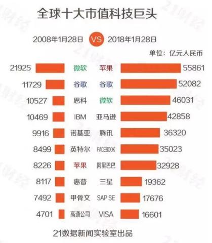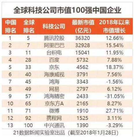 在北京时间2018年1月28日,21数据新闻实验室公布了“2018年全球科技公司市值100强”的名单。
