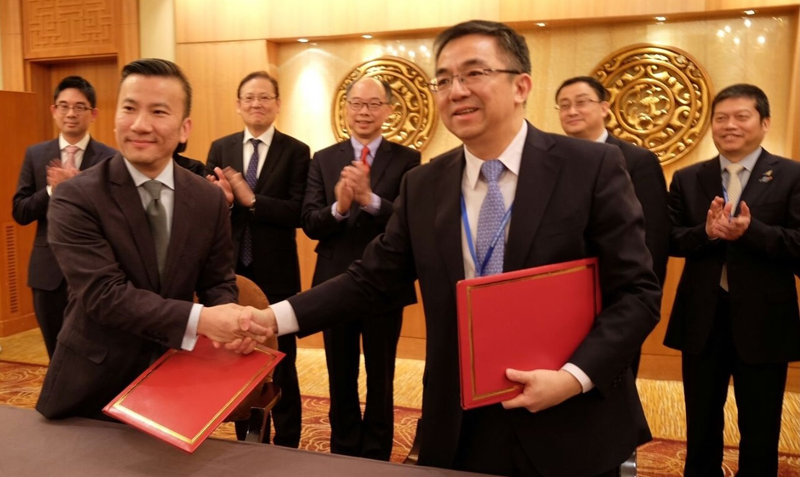 運房局副秘書長劉家麒(前左)與民航局運輸司副司長于彪(前右)簽訂備忘錄后握手。