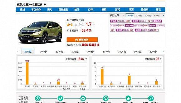 在第三方汽车质量评价平台车质网上,东风本田第五代CR-V的用户满意度已跌倒1.7分(满分5分),2017年款车型共接到了1646个投诉,其中机油增多投诉数量多达986个,机油乳化投诉数量为172个,而涵盖车型方面,除了搭载1.5T涡轮增压发动机的240TURBO车型外,使用2.0升混合动力系统的净驰版等混动车型也开始出现机油乳化现象。