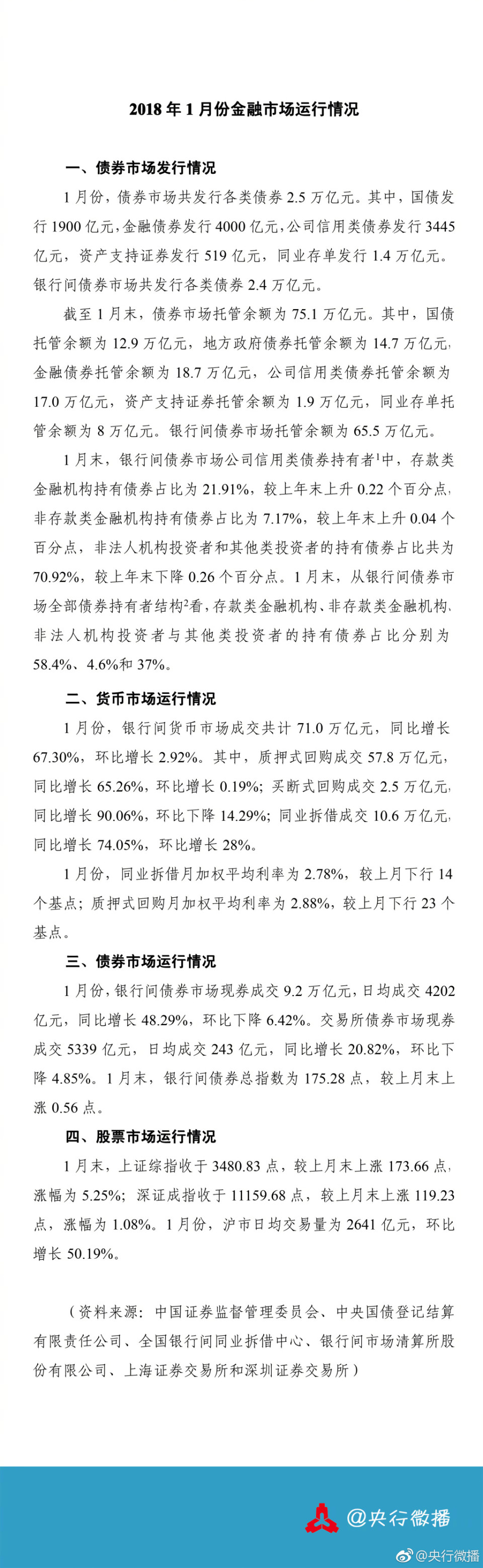1月份,债券市场共发行各类债券2.5万亿元;银行间货币市场成交共计71.0万亿元,同比增长67.30%,环比增长2.92%;银行间债券市场现券成交9.2万亿元,日均成交4202亿元,同比增长48.29%,环比下降6.42%。