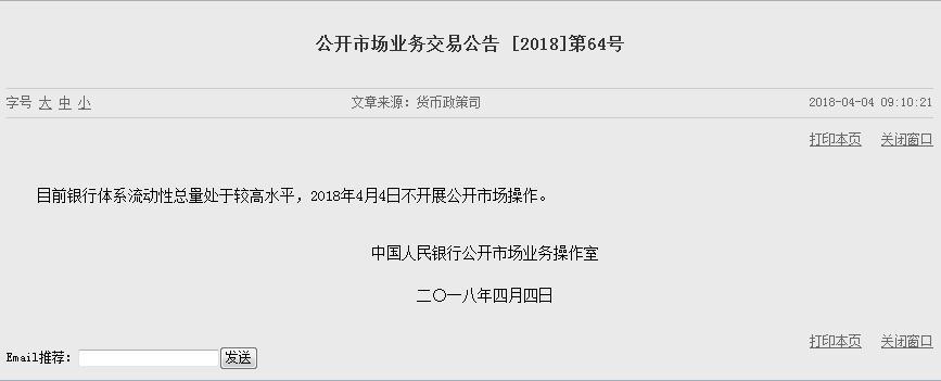 央行网站4日发布公告称,目前银行体系流动性总量处于较高水平,2018年4月4日不开展公开市场操作。这已是央行连续第九天暂停公开市场操作,当日无逆回购到期,