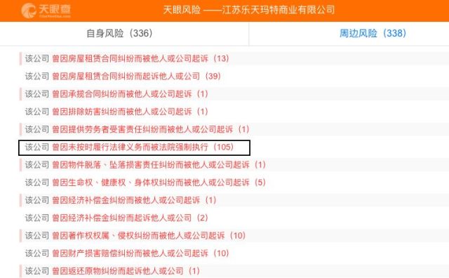 天眼查信息显示,香港丰捷的子公司江苏乐天玛特商业有限公司从2017年7月起短短半年内,已有105次因未按时履行法律义务被法院强制执行。