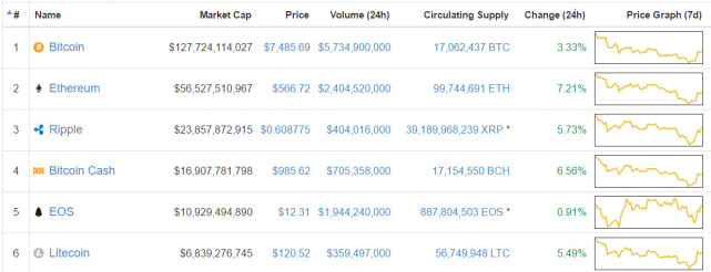 根據加密數字貨幣數據分析網站CoinMarketCap提供的數據,截至美國東部時間周二下午4點(北京時間周三淩晨4點),比特幣價格在過去24個小時裏上漲3.33%,至7485.69美元。