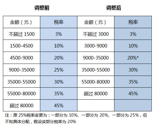 具体是:扩大3%、10%、20%三档低税率的级距,3%税率的级距扩大一倍,现行税率为10%的部分所得的税率降为3%;大幅扩大10%税率的级距,现行税率为20%的所得,以及现行税率为25%的部分所得的税率降为10%;现行税率为25%的部分所得的税率降为20%;相应缩小25%税率的级距,30%、35%、45%这三档较高税率的级距保持不变。