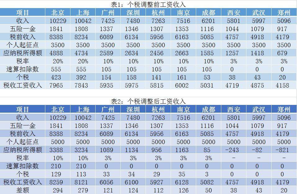 对比表一、表二可以看出,在个税方案调整后,首先,对于北京、上海两座城市的人来说,无疑是一个重大利好,因为起征点的提高,加上税率由此前的20%直降为10%,对于这两座城市而言,其每月可以“赚”近300元;其次,对于广州、深圳、杭州、南京四座城市的人而言,也可以“小赚一笔”,大约可以少交100多元;而对于成都、西安、武汉和郑州这些城市而言,其原本的税率本就不高,而且在职员工工资平均水平也相对较低,所以对这四座城市来说,个税方案的调整对其影响较小。
