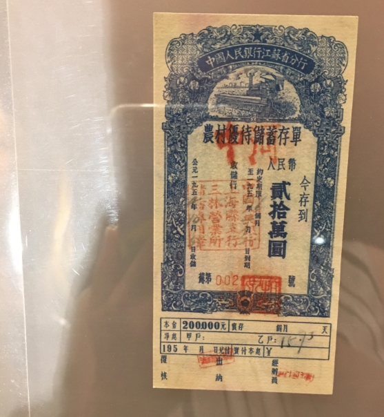 走出營業所,展覽櫥窗裏一組1954年面值最低1萬元、最高20萬元的農村優待(售糧)儲蓄存單吸引了記者的目光,存單五彩斑斕,圖案各不一樣,頗具中國特色。據了解,這些存單僅在1953年和1954年秋季開辦過兩次,國家為了鼓勵農村售糧戶,特別給予高息。這是農行成立初期,非常珍貴而獨有的歷史資料。