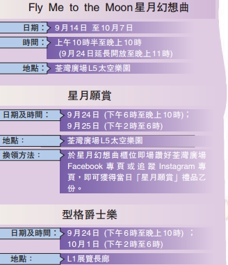 活動期間,商場推出「星月願賞」小禮物換領,如夜光棉花糖及星空特飲等,此外,於指定日子,商場更特別邀請了型格爵士樂隊舉行即興演奏會,您可以一展指揮才能,帶領樂團奏出您的個人風格樂章。