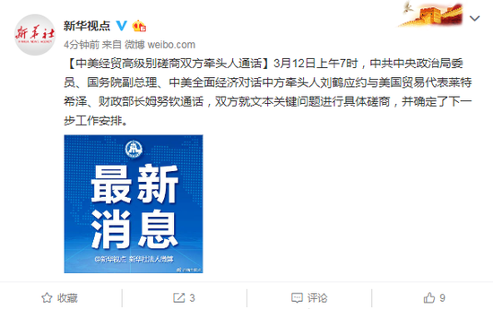 3月12日上午7时,中共中央政治局委员、国务院副总理、中美全面经济对话中方牵头人刘鹤应约与美国贸易代表莱特希泽、财政部长姆努钦通话,双方就文本关键问题进行具体磋商,并确定了下一步工作安排。