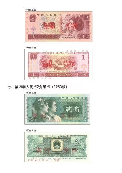 第四套人民币纸币按照面值共有9种,分别是:100元、50元、10元、5元、2元、1元、5角、2角及1角;按照发行年份共计14种,分别是:80年版100元(简称“80100”)、90年版100元(简称“90100”)、80年版50元(简称“8050”)、90年版50元(简称“9050”)、80年版10元(简称“8010”)、80年版5元(简称“805”)、80年版2元(简称“802”)、90年版2元(简称“902”)、80年版1元(简称“801”)、90年版1元(简称“901”)、96年版1元(简称“961”)、80年版5角(简称“8005”)、80年版2角(简称“8002”)、80年版1角(简称“8001”),但目前8005和8001都未退出流通,这种纸币是不可以上市交易的。图:中国人民银行公布的退出流通的第四套人民币部分券别图样(不含5角和1角)