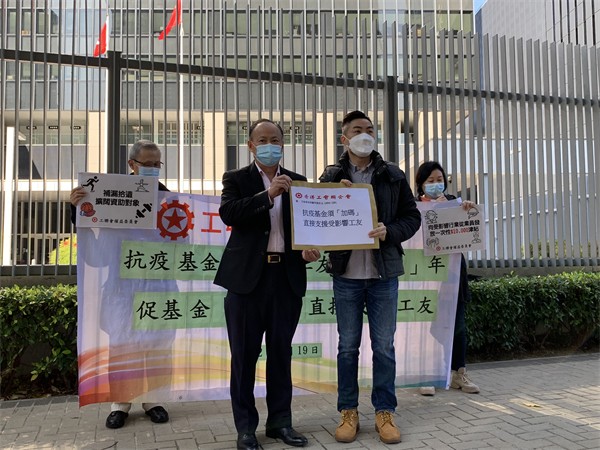工聯權委主任丘燿誠聯同受影響行業工會代表今日(19日)到政府總部請願,促請政府為抗疫基金5.0「加碼」,向受影響行業從業員發放一次性現金津貼;另設立上限$9000(70117.2港元)、為期半年緊急失業/停工現金津貼,以真正達到「快狠準」效果。