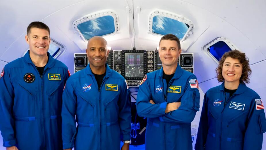 當地時間3月29日,「阿耳忒彌斯2號」繞月飛行任務太空人(左起)克里斯蒂娜·科赫、里德·懷斯曼(坐者)、維克多·格洛弗以及傑里米·漢森在美國休斯敦留影。(NASA供圖)