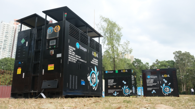 頂圖圖說:Towngas與合作夥伴共同開發的一體化氫能發電機,產電的過程只會產生水蒸氣。該機組早前已成功支援於粉嶺舉辦的十五運會高爾夫球賽事,日後亦可用於地盤工地發電,取代碳排放高的柴油發電機。