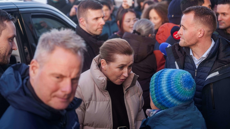 頂圖圖說:1月23日,丹麥首相弗雷澤里克森(中)在丹麥自治領地格陵蘭島首府努克與一名女子交談。(新華社)