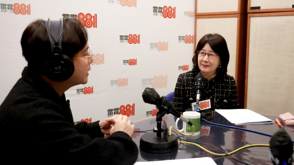 頂圖:私隱專員鍾麗玲(右)與商業電台第一台雷霆881節目主持郭志仁(左)錄製《數碼安全開心share》。私隱專員公署供圖