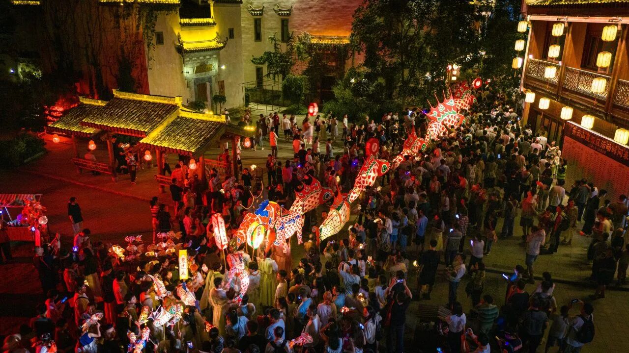 白天,遊客除了在齊雲山上的丹霞地貌、恐龍遺蹟中感受地質文化的獨特魅力,在宋元明清的古人石刻中欣賞藝術之美,還能邂逅「財神」與「月老」的巡遊賜福。而山下的齊雲逍遙街變身古風市集,古彩戲法、非遺雜技、劍氣爭霸等上百場妙趣橫生的仙俠演藝,等待遊客們參與互動,賺取遊戲銀票,體驗江湖之樂。